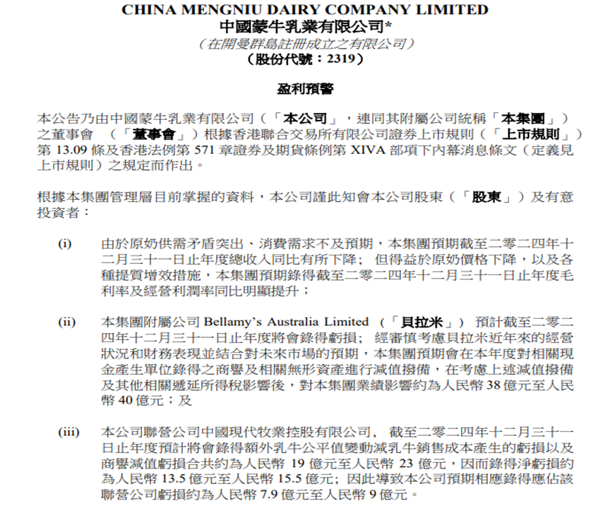 并购带来 “后遗症” 利润同比骤降主要与两笔大额计提相关。 蒙牛乳业预计贝拉米在2024年度将会录得亏损。其称,预期会在2024年度对相关现金产生单位录得的商誉及相关无形资产进行减值拨备,预计对蒙牛集团业绩影响约为38亿元至40亿元。2021年、2022年蒙牛已先后计提6.2亿元和7.42亿元的商誉减值。 另外,作为蒙牛的联营公司,现代牧业(01117.HK)在2024年预计亏损13.5亿元至15.5亿元,业绩出现巨幅倒退,导致蒙牛乳业预期相应录得应占该公司亏损约7.9亿元至9亿元。根据资料,2013年5月,蒙牛以31.75亿港元收购现代牧业26.92%股权,持股比例增至27.99%,成为单一大股东;2017年,蒙牛以18.73亿港元增持现代牧业16.7%的股权,成为其实控人。 可以看到,全速扩张带来的“后遗症”逐渐在蒙牛乳业身上显现。2013年开始,蒙牛先后收购了雅士利、贝拉米,并购妙可蓝多,与现代牧业进行联营合作,以扩大其在奶粉、奶酪、上游供应链等方面的业务版图。 蒙牛乳业奶粉业务主要由子公司雅士利和贝拉米负责运营。其中,贝拉米的业绩一直未能达到预期;雅士利两次商誉减值合计45.5亿元,由于长期亏损,雅士利已于2023年7月完成私有化从港交所退市。财报数据显示,2023年蒙牛奶粉业务实现收入38.02亿元,较2022年下降约6000万元。而2019年其奶粉业务收入为78.7亿元。 除了奶粉业务,蒙牛还在忍受并购上游牧场中国圣牧、现代牧业带来的亏损;妙可蓝多在奶酪赛道归于平静后,利润规模也出现大幅缩水。 除此之外,逐年攀升的商誉,对蒙牛而言也是一个巨大的潜在危机。根据财报,蒙牛2024年上半年的商誉为89.05亿元,已是2017年45.33亿元商誉的近两倍,其他无形资产也高达124.80亿元。蒙牛乳业资产负债率上升至56.21%,6月末的净资产负债率更是高达81.30%,而2016年该公司的资产负债率仅为48.08%。